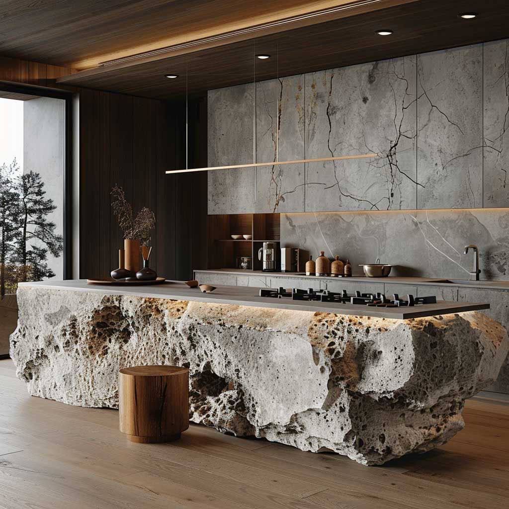 Bàn đá được chế tác từ khối đá tự nhiên nguyên khối, giữ trọn vẻ đẹp thô mộc với các vân đá và kết cấu gồ ghề đầy nghệ thuật. Phần mặt bàn phẳng mịn kết hợp cùng chân đế tạo hình tự nhiên mang đến cảm giác vững chãi nhưng vẫn tinh tế. Sự hòa quyện giữa chất liệu đá nguyên bản và không gian gỗ ấm áp giúp sản phẩm trở thành điểm nhấn ấn tượng, phù hợp cho những không gian bếp, đảo bếp hoặc khu vực tiếp khách mang phong cách hiện đại, sang trọng và gần gũi với thiên nhiên.