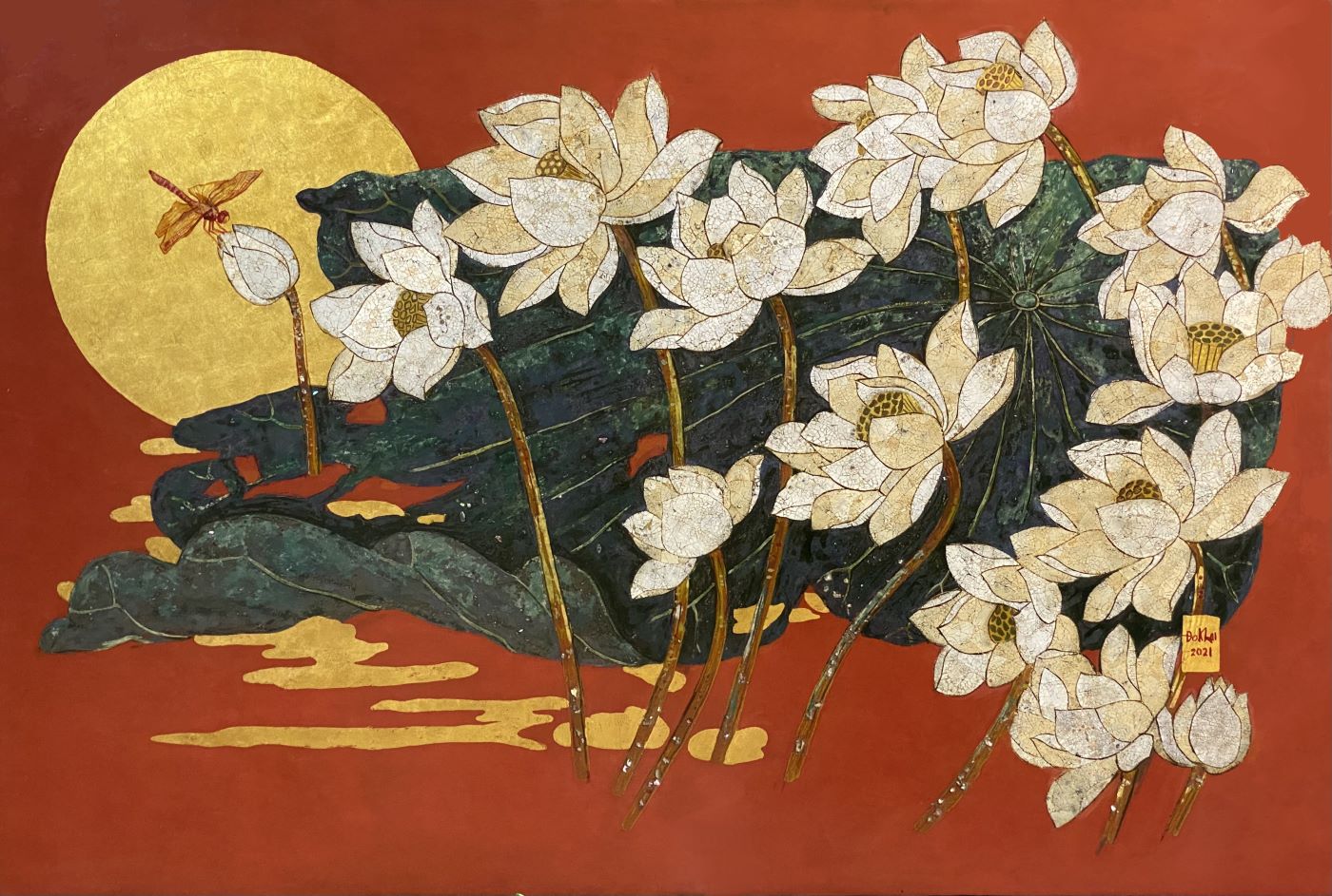 This lacquer painting depicts delicate white lotus blossoms gracefully rising against a backdrop of deep green lotus leaves, highlighted by a golden moon (or sun) against a warm, deep crimson background. The graceful lines, the lacquer finish, and the metallic sheen create depth, giving it a classic and elegant beauty.