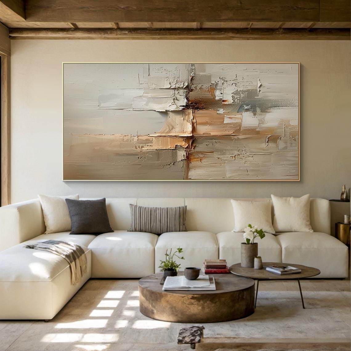 The FANTASY abstract painting impresses with its modern composition and gentle neutral color scheme. The layers of paint are created using a spatula technique, giving a rustic yet luxurious feel. The interwoven beige, cream and brown color blocks create a harmonious visual effect, helping the painting easily blend in with many different interior styles such as minimalist, Scandinavian or high-end modern.
