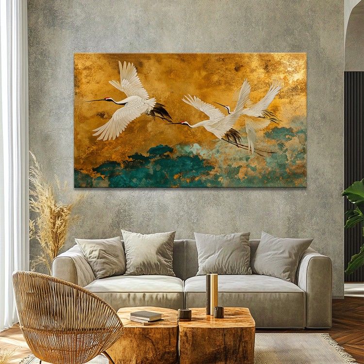 The painting is a high-class lacquer artwork, the shimmering gold background combines with the image of a graceful, elegant golden crane. The sophisticated lacquer technique helps every detail of the crane stand out, creating a soft, lively and luxurious feeling for the space.