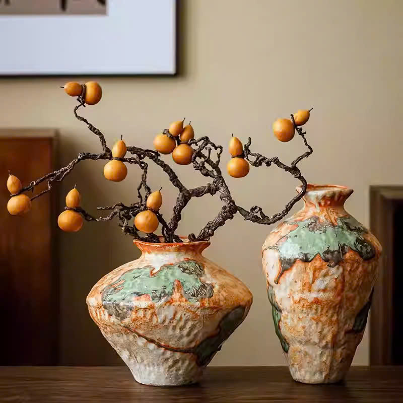 Bức ảnh khắc họa hai chiếc bình gốm đặt cạnh nhau trên mặt bàn gỗ, mang phong cách thủ công và nghệ thuật rõ nét. Bình có dáng tròn, thân phình nhẹ, miệng loe, bề mặt phủ lớp men loang với sự hòa trộn của các gam màu đất như nâu, cam, xanh rêu và trắng, tạo cảm giác tự nhiên như đá và đất nung cổ.
