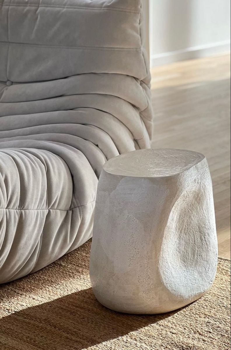 Bàn đá sở hữu hình khối tròn bo mềm mại, bề mặt mịn mộc với những vết chạm thủ công tự nhiên, tạo cảm giác yên tĩnh và vững chãi. Ánh sáng lướt nhẹ trên bề mặt đá làm nổi bật sắc trắng trầm và kết cấu nguyên bản, mang đến vẻ đẹp giản dị nhưng đầy chiều sâu, giúp không gian trở nên ấm áp, cân bằng và thư thái.