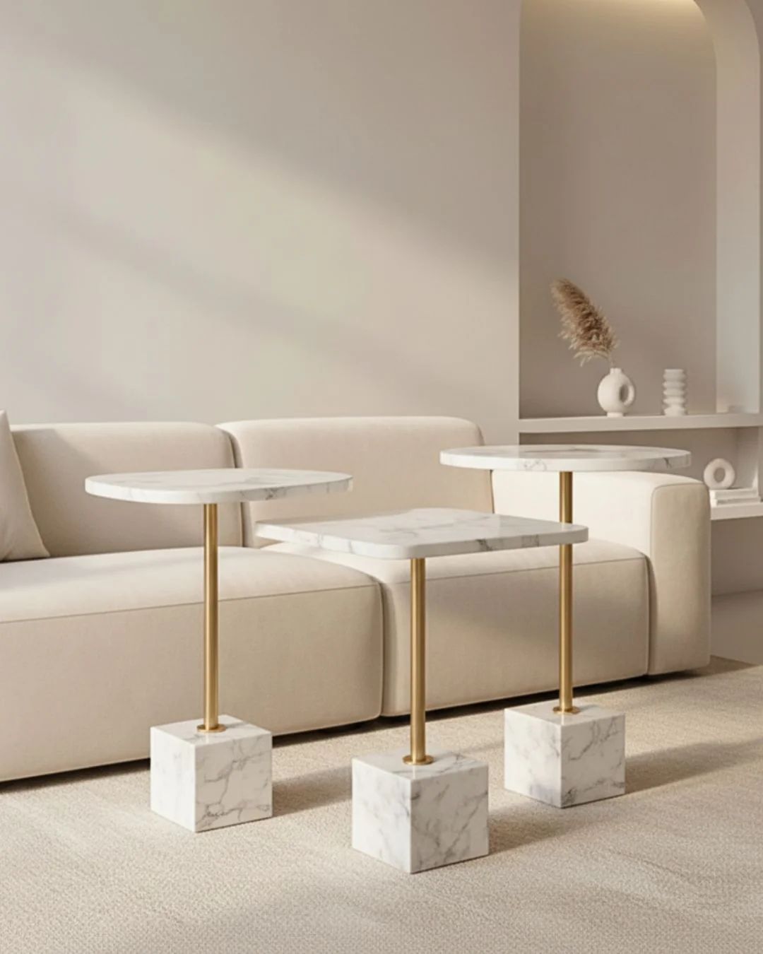 この石のテーブルは、ミニマルでありながら高級感のあるデザインが印象的です。天然の美しい縞模様の石の天板、細身の金メッキの金属脚、そして頑丈な石のベースが、その魅力を際立たせています。ニュートラルなカラースキームは、モダンからハイエンドまで、様々なインテリアスタイルに自然に溶け込みます。実用的なサイドテーブルであるだけでなく、美しいアクセントとして、あらゆるリビングスペースにエレガントさと洗練さをもたらします。
