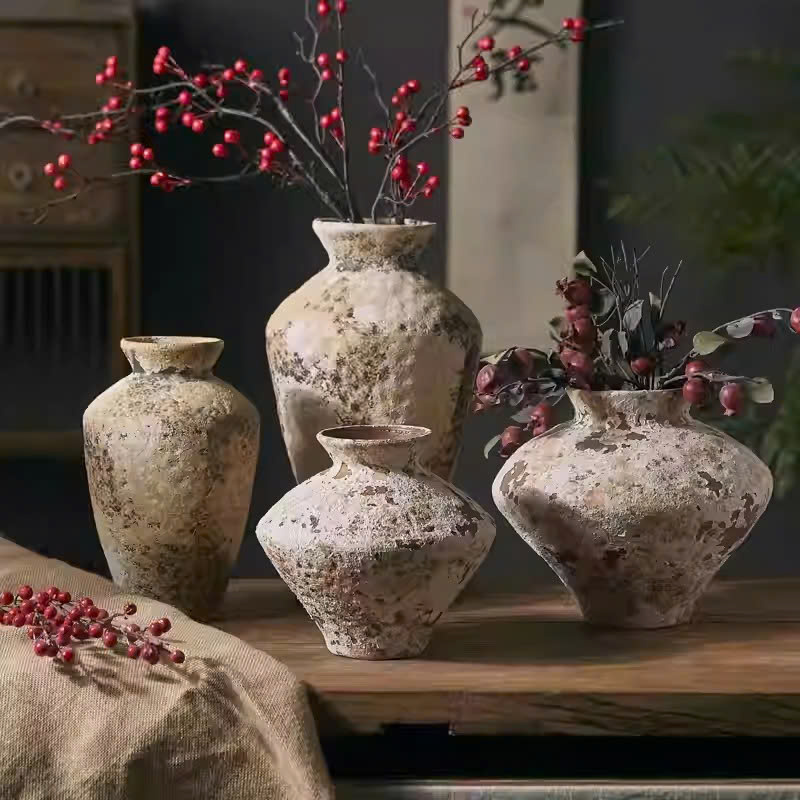 この写真は、温かく居心地の良い雰囲気の中で、木製のテーブルの上に置かれた様々なサイズの陶器の花瓶のセットを捉えています。花瓶はアイボリー、ベージュ、ライトブラウンといったニュートラルカラーで、まだら模様の緑青仕上げが施されており、クラシックで素朴、そしてやや荒々しい雰囲気を醸し出しています。それぞれの花瓶の中には、小さな赤い実をつけた枯れ枝が飾られ、柔らかな陶器の背景に映えています。柔らかな光がそれぞれの花瓶の素材とラインを際立たせ、静寂、洗練、そして自然との親密さを感じさせます。