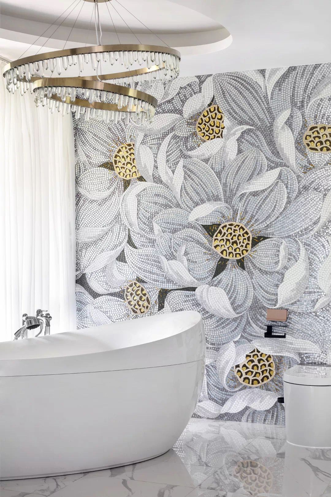 この絵画は洗練された陶芸作品で、温かみのあるダークな背景に、金色の雌しべを持つ花が咲き誇る様子が描かれています。高級バスルーム空間に、贅沢で優雅な雰囲気とくつろぎの空間をもたらします。細部に至るまで精巧に作られ、鮮やかで繊細な独特のモザイク模様を生み出しています。