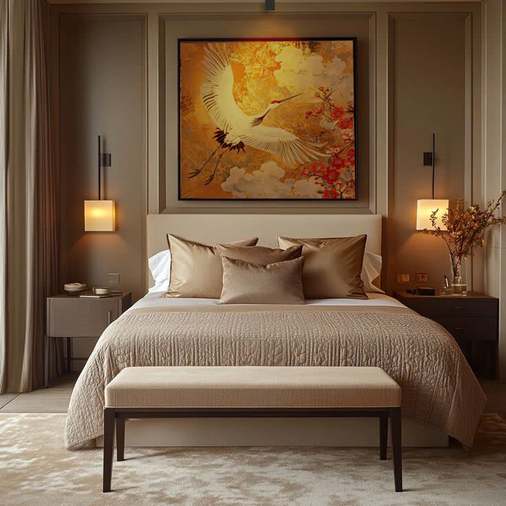 Màu sắc: Nền vàng óng – chi tiết hạc trắng, hoa đỏ