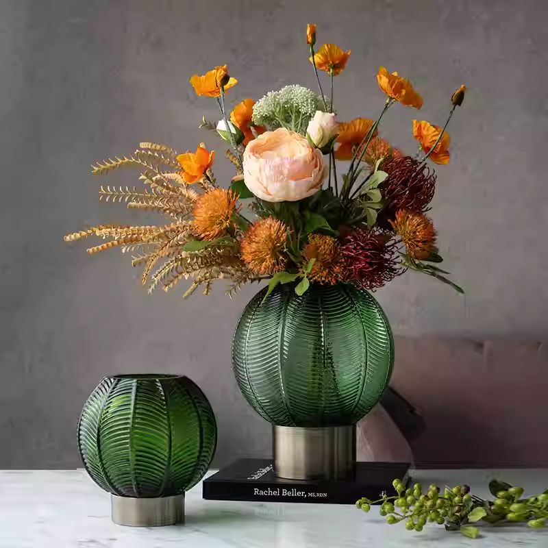 Bình thủy tinh được thiết kế với dáng tròn và dáng cao cân đối, bề mặt vân sọc nổi đều tạo chiều sâu và hiệu ứng ánh sáng ấn tượng. Tông màu xanh lục trầm kết hợp chân đế kim loại mang đến cảm giác sang trọng, chắc chắn và hiện đại. Khi cắm hoa, bình giúp tôn lên vẻ đẹp tự nhiên của hoa lá, đồng thời tạo điểm nhấn nghệ thuật tinh tế cho không gian nội thất.