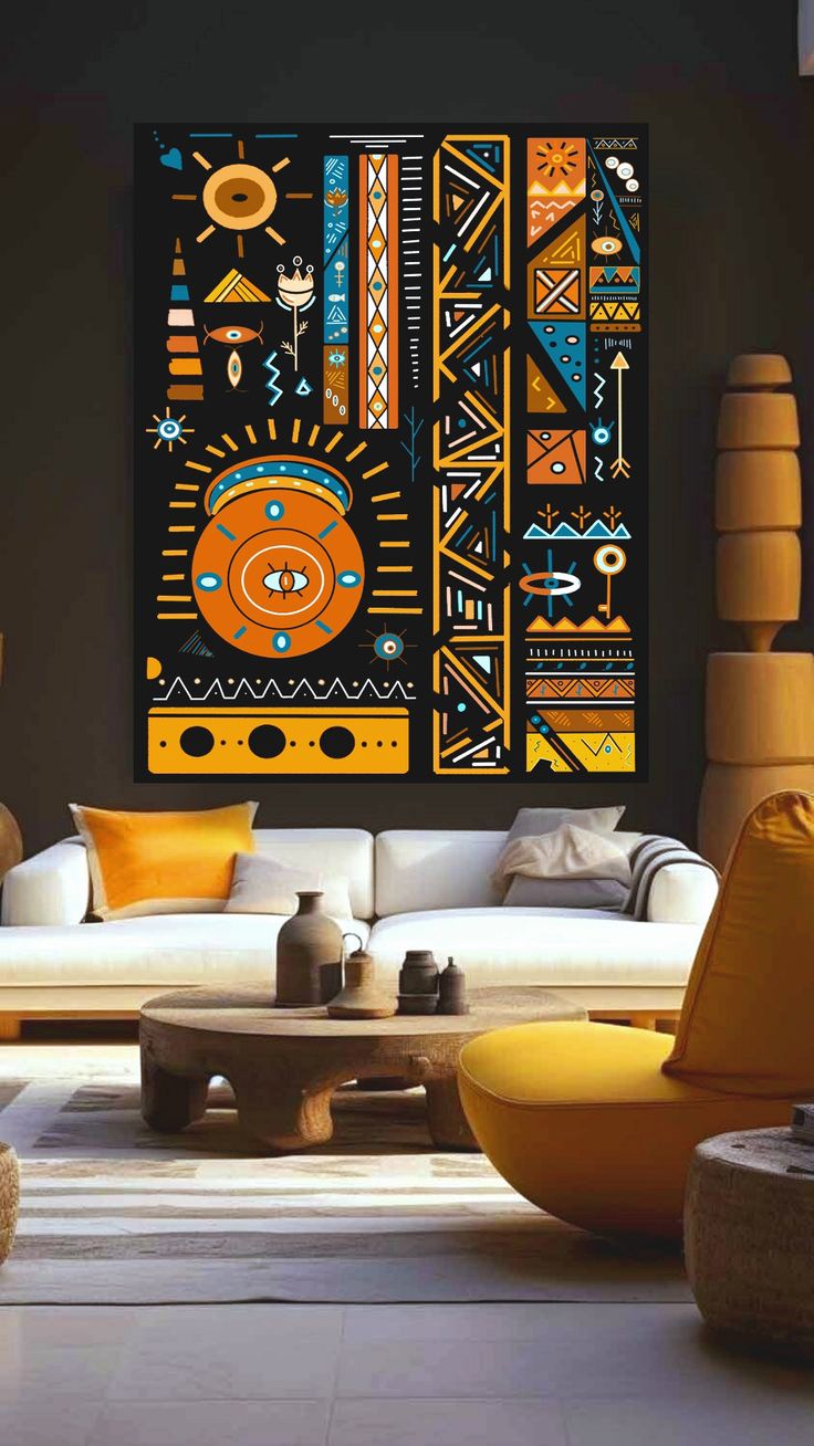 Trong tranh xuất hiện nhiều biểu tượng hình học như vòng tròn, tam giác, đường kẻ, mũi tên, hoa cách điệu và những “con mắt” tượng trưng, tất cả tạo thành nhịp điệu thị giác mạnh mẽ. Bố cục cân bằng giữa chi tiết lớn và nhỏ, giống như cách người thợ thổ cẩm phối các mô-típ trên khung dệt.