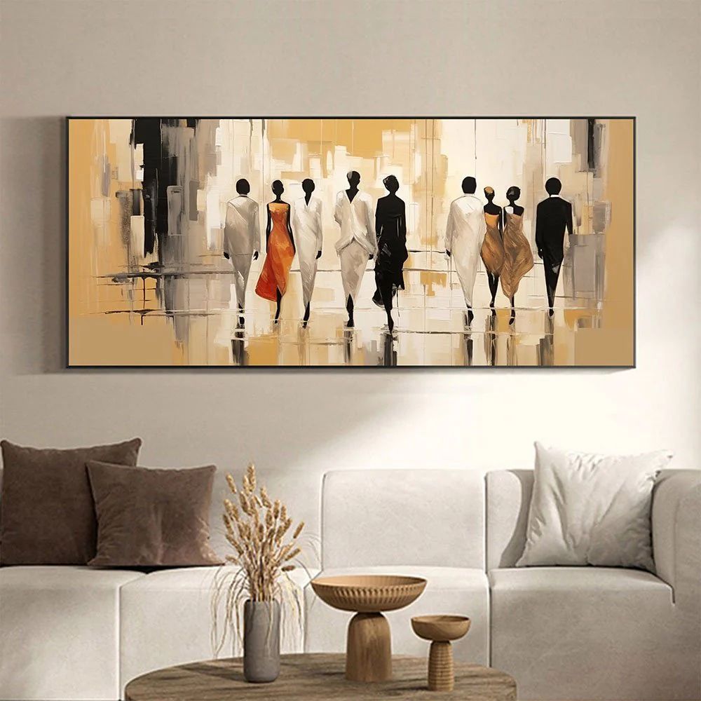 Các dáng người được kéo dài, thon gọn, mang tính nghệ thuật cao. Một số mặc trang phục màu trắng, vài người mặc màu cam hoặc nâu vàng, tạo điểm nhấn nổi bật trong tổng thể. Nền tranh gồm những mảng khối trừu tượng xếp lớp, khiến không gian trông như một thành phố mờ ảo hoặc một sân khấu ánh sáng.