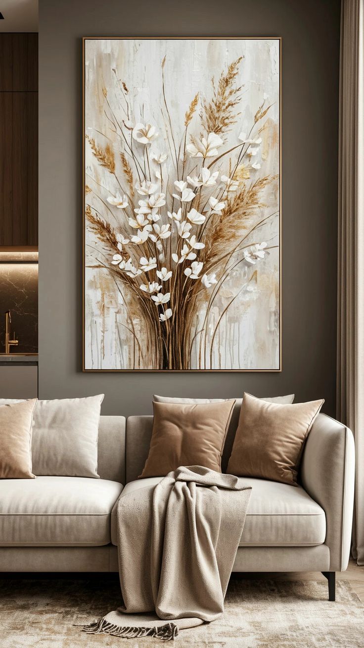 Bức tranh mang tông màu nâu – trắng nhẹ nhàng mô tả những cành hoa và bông lúa thanh thoát trên nền họa tiết trừu tượng . Tác phẩm tạo cảm giác tinh tế,  gần gũi với thiên nhiên và phù hợp trang trí nhiều không gian như phòng khách , phòng ngủ hay văn phòng để mang lại cảm giác ấm áp và trang nhã.