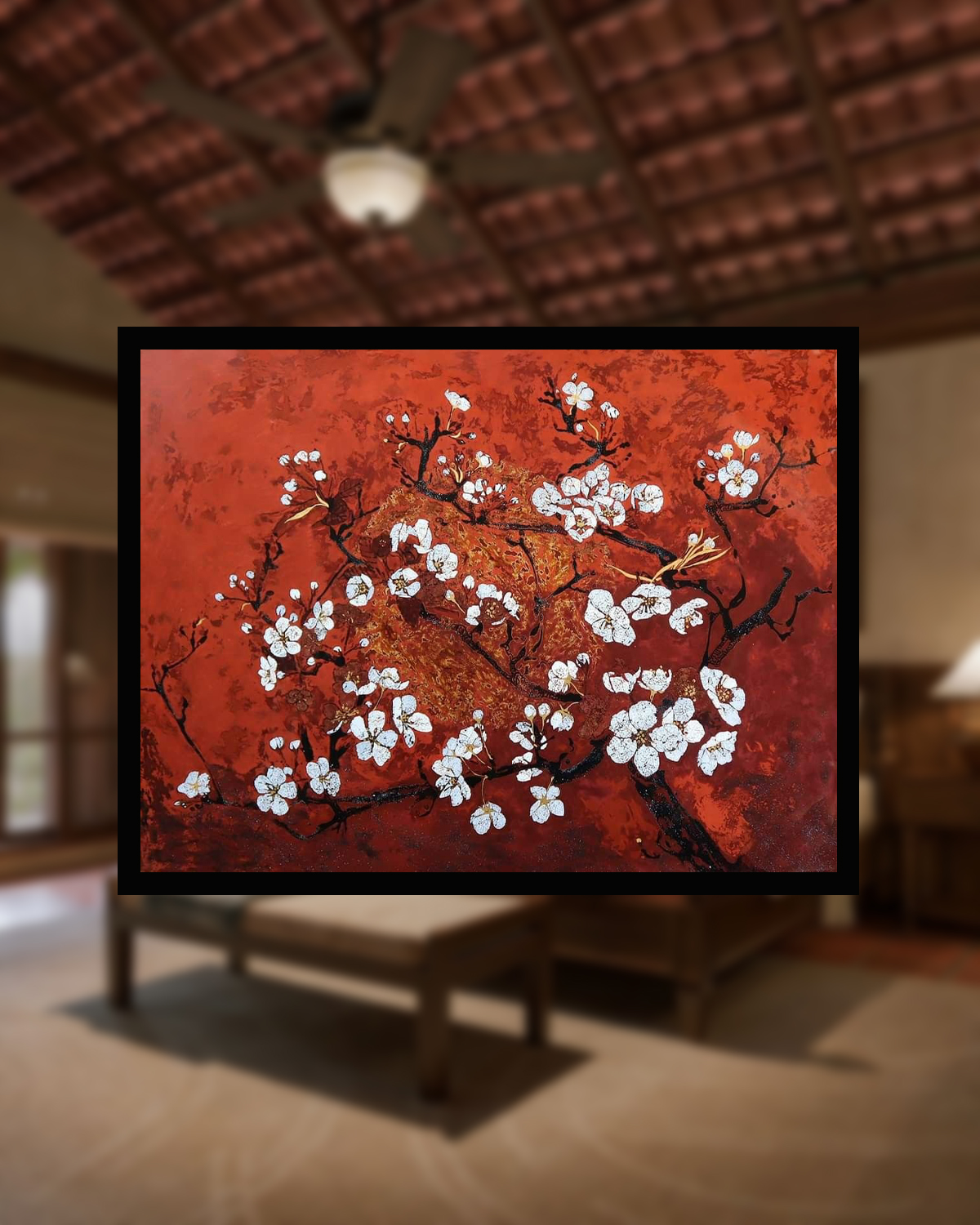Tác phẩm được chế tác bằng kỹ thuật sơn mài truyền thống, nhiều lớp sơn phủ được xử lý tỉ mỉ, tạo chiều sâu và hiệu ứng ánh sáng đặc trưng. Các cánh hoa mai trắng tinh khôi nổi bật trên nền đỏ, được tô điểm bằng kỹ thuật dát ánh kim tinh xảo, làm tăng sự sang trọng và tính nghệ thuật. Đây không chỉ là một bức tranh trang trí, mà còn là một biểu tượng mang giá trị phong thủy, đem lại sự may mắn và phồn vinh cho gia chủ.