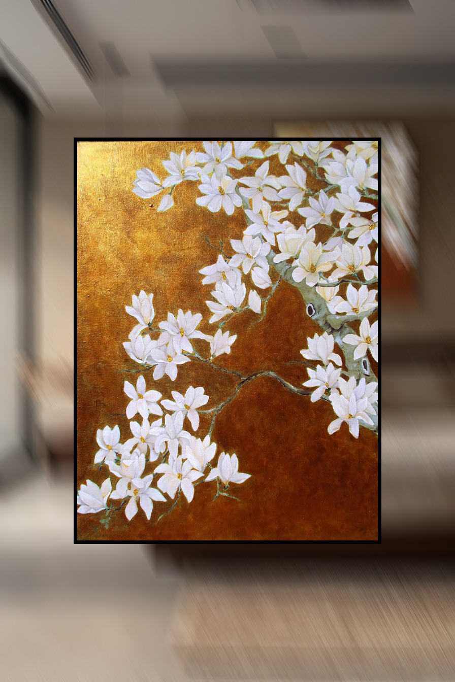 Màu sắc: trắng tinh khôi của hoa mộc lan trên nền vàng kim sang trọng.