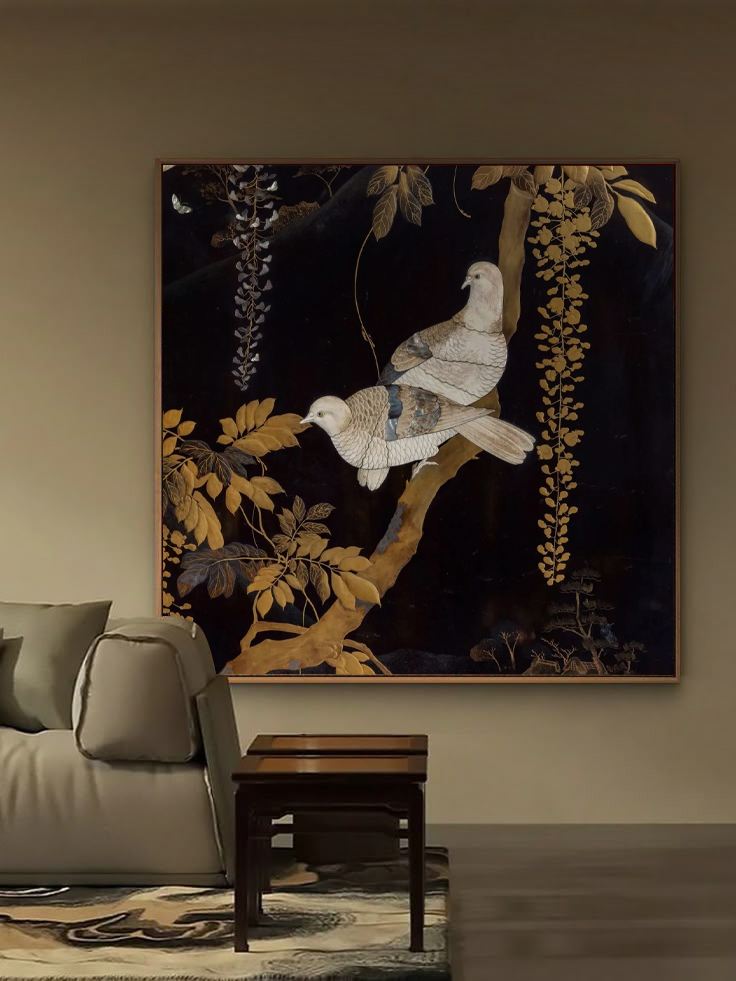 Tranh được chế tác thủ công theo kỹ thuật sơn mài truyền thống, trải qua nhiều lớp sơn phủ và mài hoàn thiện tạo nên chiều sâu cuốn hút cùng hiệu ứng ánh sáng đặc trưng của sơn mài. Hình ảnh đôi chim uyên ương được khắc họa tinh tế, kết hợp các mảng dát vàng điểm xuyết trên nền đen – nâu trầm, mang lại cảm giác sang trọng và ấm áp. Tác phẩm không chỉ có giá trị thẩm mỹ cao mà còn mang ý nghĩa phong thủy tốt lành, tượng trưng cho tình yêu thủy chung, hạnh phúc viên mãn và sự hòa hợp trong gia đình.