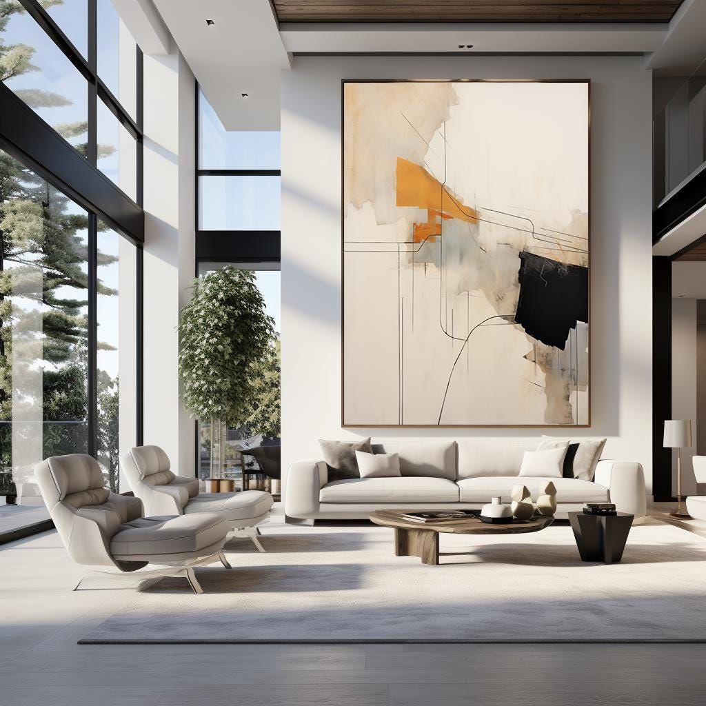 Bức tranh là một tác phẩm trừu tượng với nền sáng, điểm nhấn bởi mảng cam nổi bật và khối đen mạnh mẽ. Các đường nét mảnh đan xen tạo cảm giác chuyển động, mang lại bố cục hài hòa nhưng đầy tương phản và chiều sâu.
