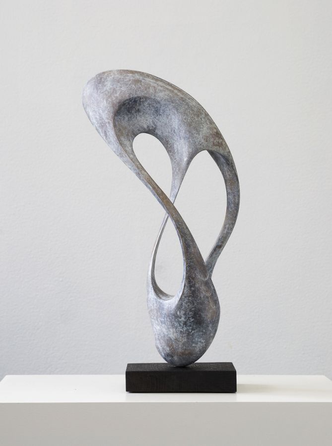 Được chế tác từ chất liệu composite cao cấp, bề mặt tác phẩm được hoàn thiện tỉ mỉ với tông màu xám loang tinh tế, tạo hiệu ứng thị giác sang trọng và hiện đại. Các đường cong mềm mại đan xen, tạo nên sự hài hòa giữa hình khối và khoảng trống, gợi liên tưởng đến sự kết nối và dòng chảy không ngừng của thời gian. Tác phẩm không chỉ là một vật trưng bày, mà còn truyền tải thông điệp về sự cân bằng và vẻ đẹp vĩnh cửu.